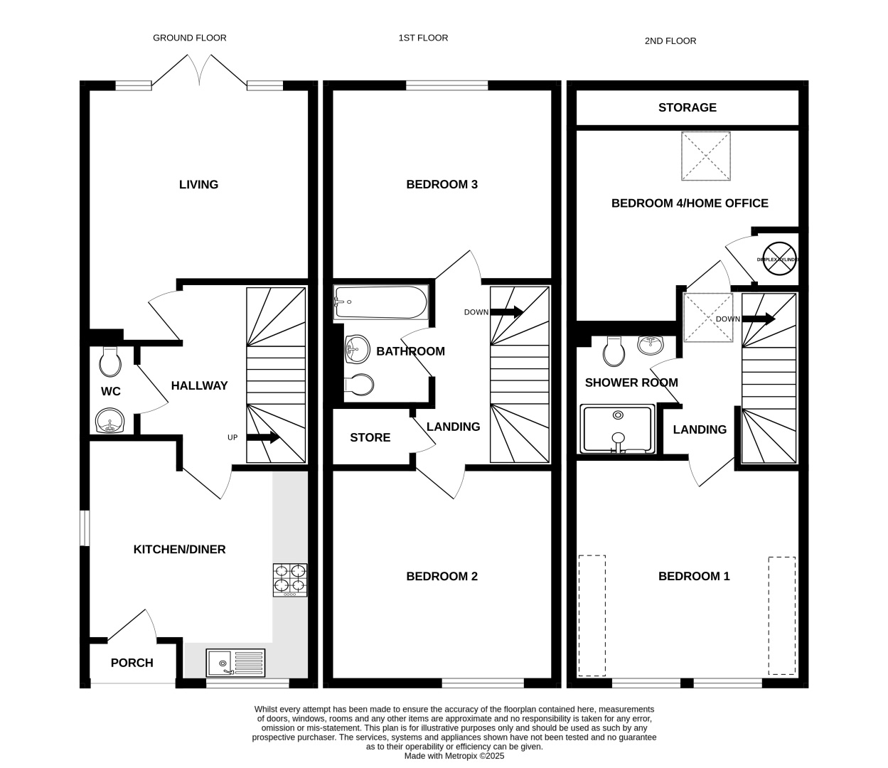 The ground floor comprises the living space with kitchen/diner to the front and lounge opening via French doors and side screen windows to the garden at the rear. The staircase leads to 2 bedrooms and bathroom on the first floor and then to a master en-suite bedroom with raised ceiling and the fourth bedroom on the second floor.