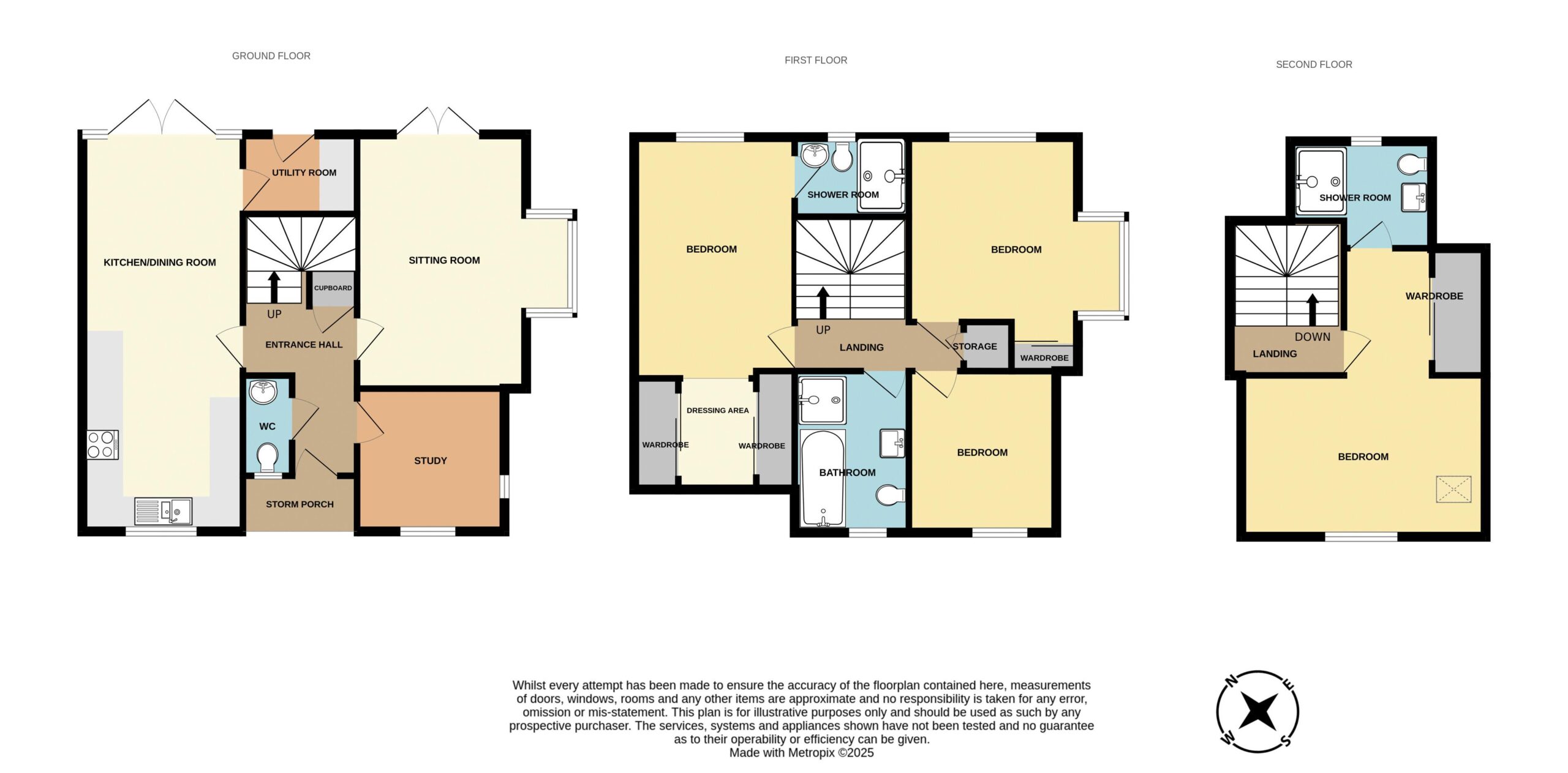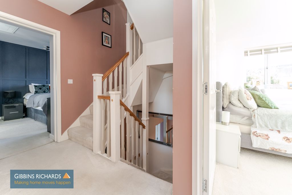 A superbly presented ex show home boasting generous size accommodation on three floors. Reception hall, cloakroom, study, generous size sitting room, large full length open plan kitchen/dining room, separate utility room, three first floor bedrooms including en-suite shower room and dressing area and family bathroom to the first floor. Large second floor bedroom with further en-suite shower room and dressing area. Driveway, garage, private rear garden. Energy Rating: C