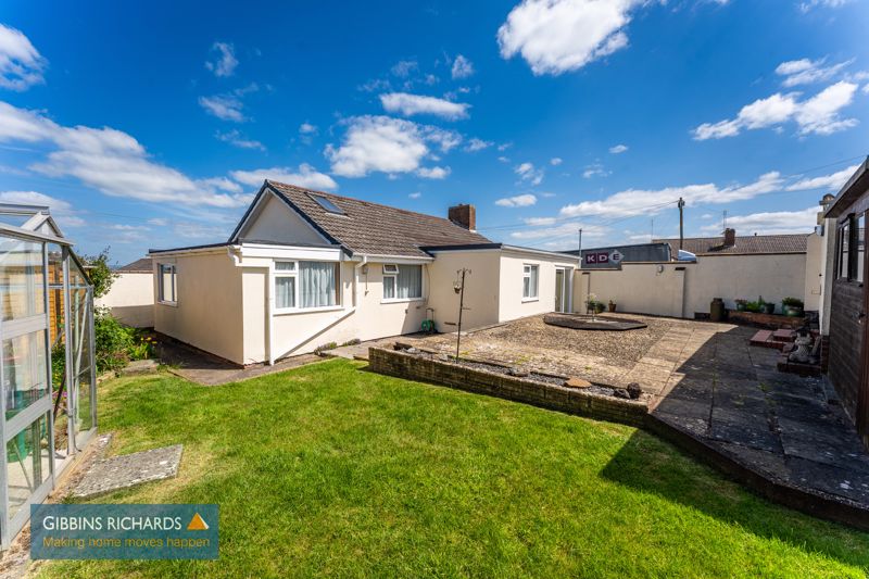 Corner plot gardens which are predominantly laid to lawn with a side gate leading through to the rear garden with sun patio, raised gravel/patio area, aluminum greenhouse, lawn section, further raised ornamental gravel bed, timber storage shed and door to garage.