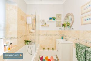 Side aspect obscure window. Fitted in a three piece suite comprising low level WC, wash hand basin and bath with overhead electric shower.