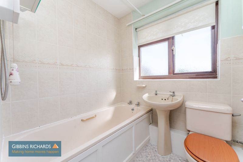 Rear aspect obscure window. Low level WC, wash hand basin and bath with overhead electric shower.