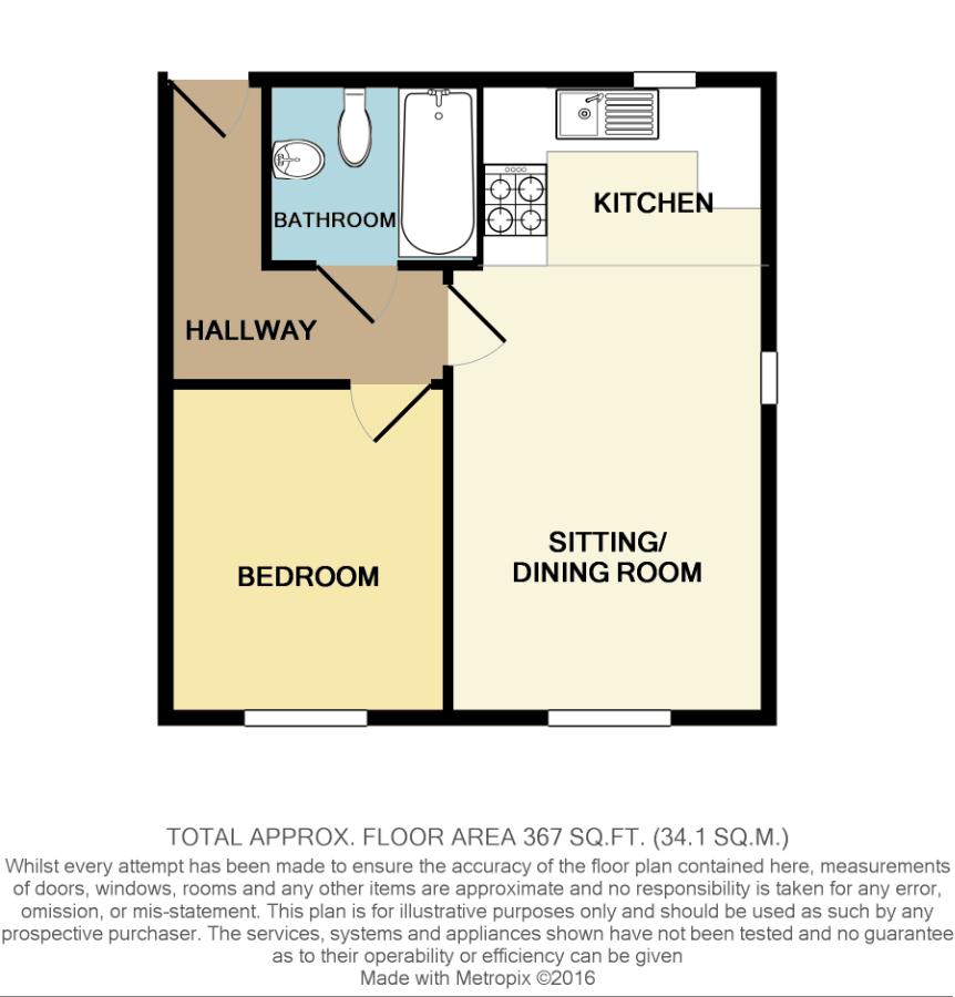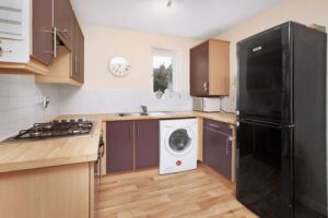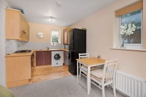 with the kitchen area having built-in oven hob and extractor hood.