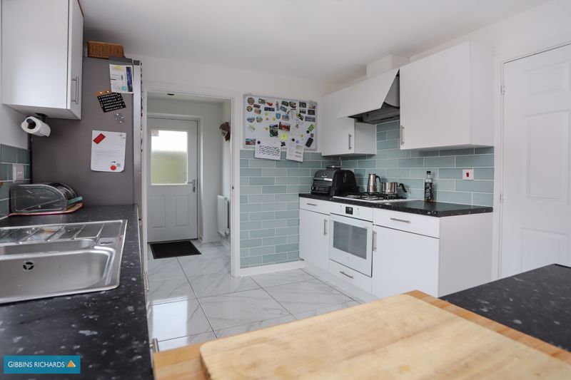 Rear aspect window and French doors to garden. Fitted with a modern range of floor and wall cupboard units. Integrated oven and hob with extractor fan over.
