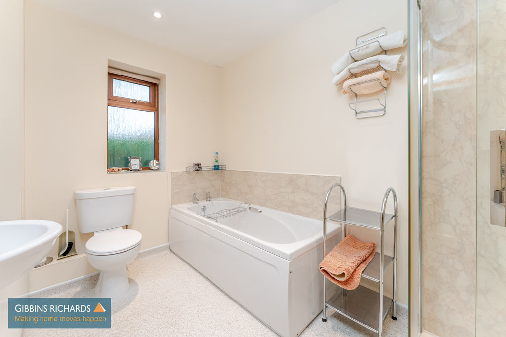 Side aspect window,. Low level WC, wash hand basin, bath and separate walk in shower. Heated towel rail.