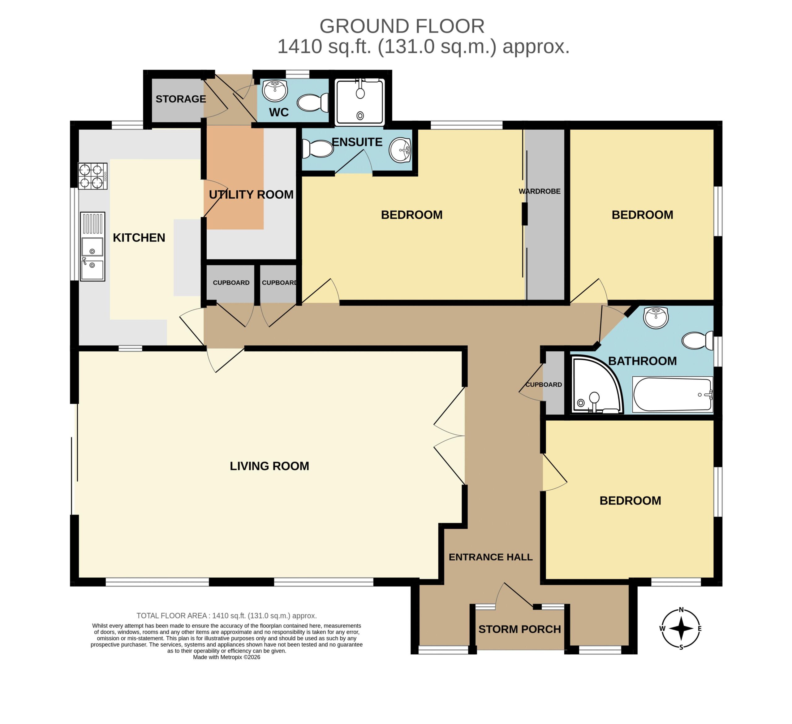Low level WC, wash hand basin, shower enclosure. Heated towel rail.