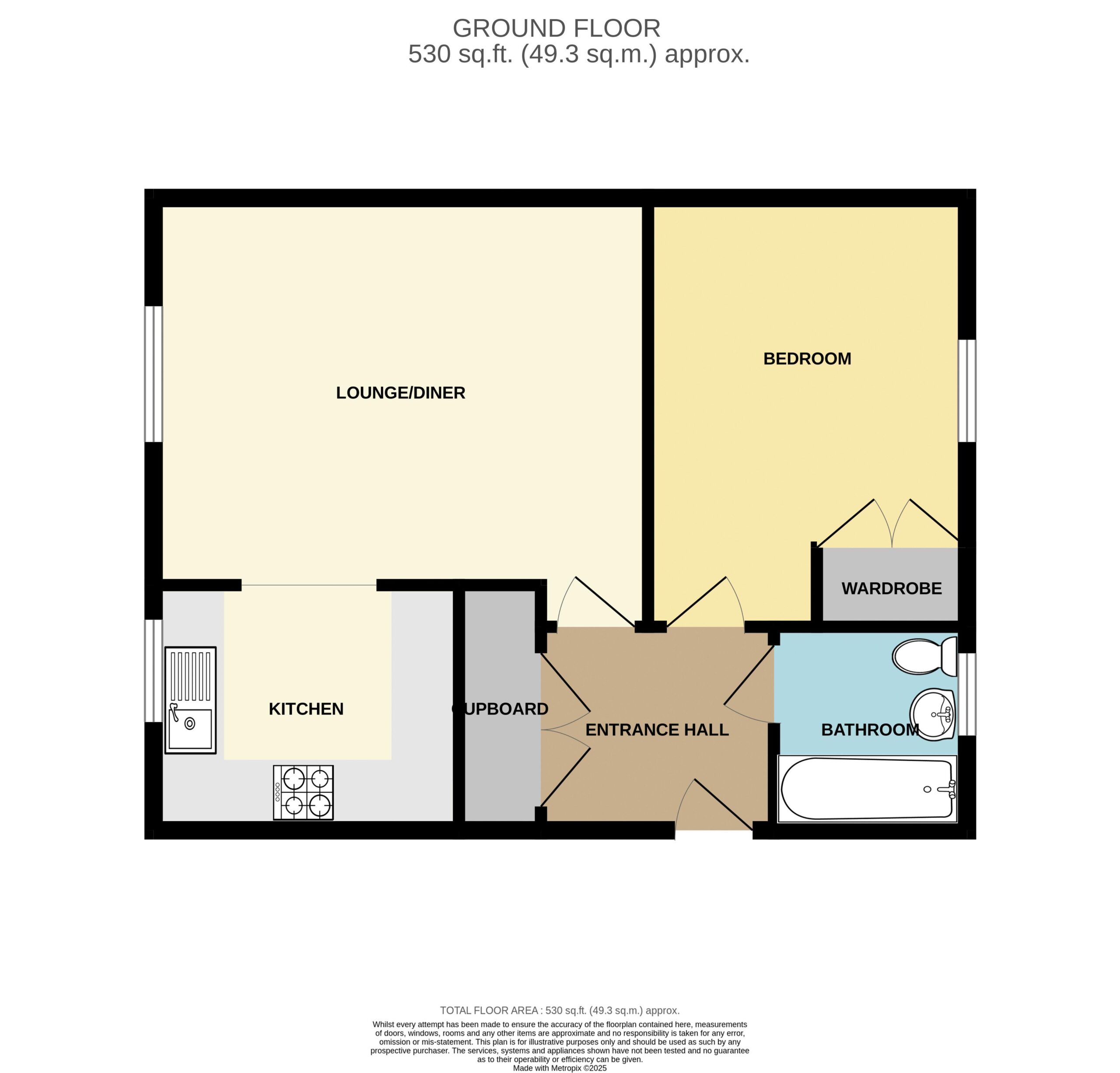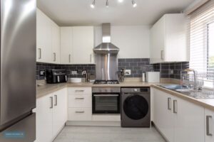 Kitchen 9′ 7” x 7′ 8” (2.92m x 2.34m) Double glazed window to front. Range of modern base and wall mounted cupboards with built-in oven, hob and extractor hood, space for upright fridge/freezer and space for washing machine.