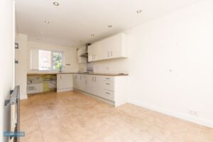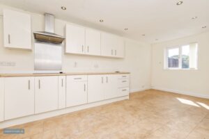 Fitted with a modern range of units with integrated Bosch double electric oven, four ring electric Lamona hob with extractor fan and light over. Large pantry cupboard.