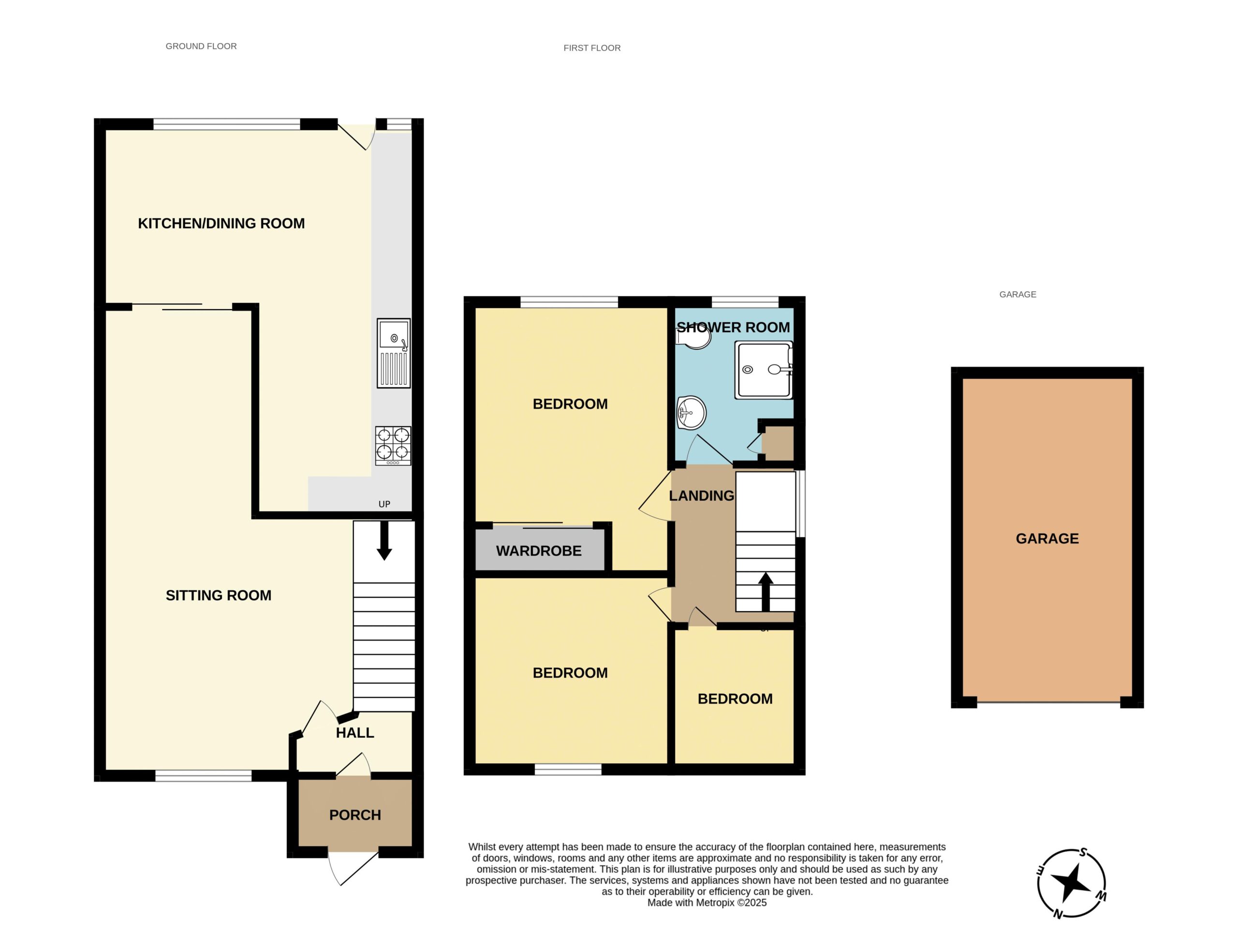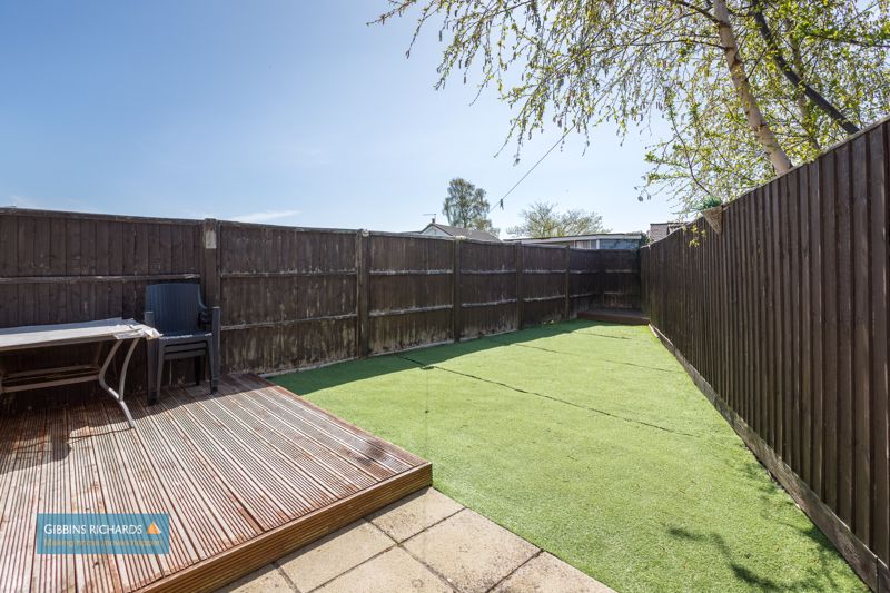Open plan lawn garden with driveway leading to detached SINGLE GARAGE and side gate leading to the rear garden which is fully enclosed with decking section, artificial lawn, side courtyard and storage shed.