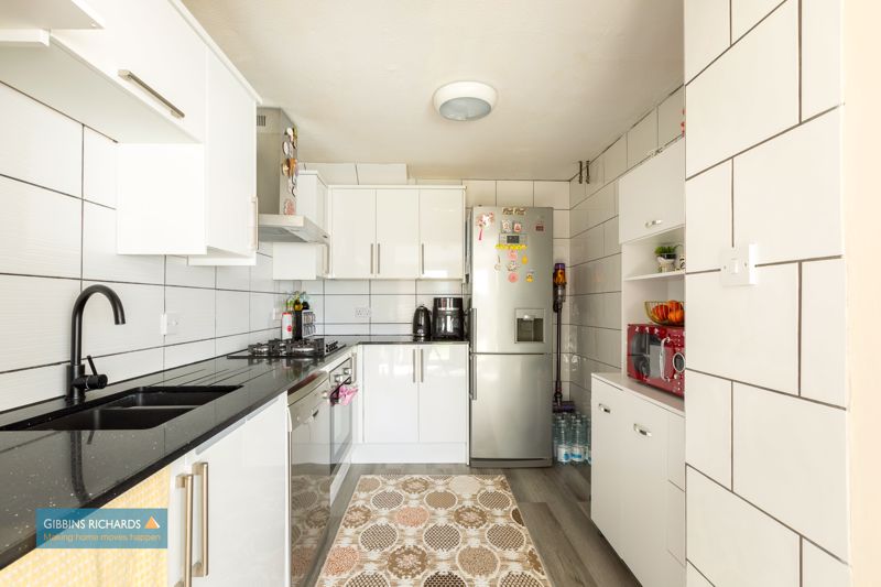 (‘L’ shaped) 19′ 3” x 15′ 5” (5.86m x 4.70m) reducing to 8′ 10” (2.69m) wide to dining section. Attractively fitted with a comprehensive range of high gloss units with ‘Quartz’ worktops, built-in oven and gas hob. Access to rear garden.