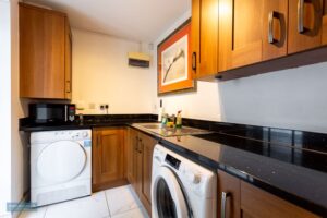 Range of base and wall units with Indian granite work tops and sink. Space for washing machine and tumble dryer. Central heating boiler.