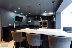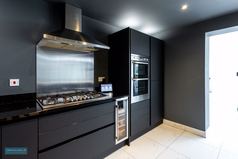 Fitted with a modern range of low-level mat black units, integrated eye level double oven and grill, six ring gas hob with extractor hood over, an extra four ring induction hob on the island. Two Charging points at each end of the island for wireless charging that electronically pop up out of the island with two plug sockets, two USB sockets and Bluetooth speakers. Built-in wine cooler fridge, built in ‘American’ style fridge/freezer, and an extra built in single fridge/freezer. There are also Indian granite black work tops to the sides and sparkling ice white quartz work top to the island. Over the sink there is an InSinkErator hot tap which produces hot and cold water with filtered cold water and boiling hot water so there is no need for a kettle ever again. Tiled floor joining to Dining/Family Room. There is also a Nest heating system controller above the fridge.