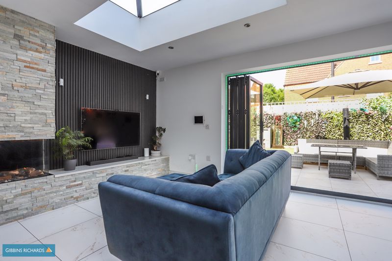 Two ceiling lanterns. Remote control Bell Gas fire. Aluminium Bi-fold doors coloured in grey to rear garden. Tiled floor joining to kitchen.