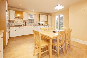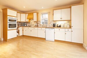 fitted with a range of modern cream coloured shaker style wall and floor storage cupboards incorporating drawers, rolled edge work surfaces and tiled splashbacks, one and a half bowl stainless steel sink unit with mixer tap, eye level double electric oven, gas hob with extractor hood over, uPVC double glazed French doors opening to rear garden, recess low voltage lighting, wood laminate flooring, radiator.