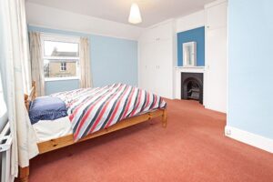 built-in wardrobes and further shelved storage cupboard, inset original cast iron fireplace, windows to front and side, picture rail, tv point, radiator.