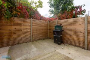 Generous sunny rear courtyard garden with a practical storage area beneath the house, offering valuable internal storage options.