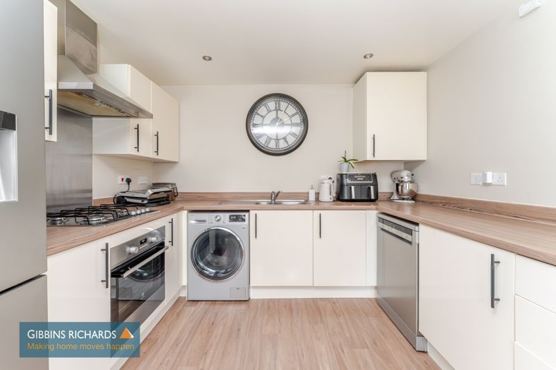 Front aspect window. Matching floor and base units. Integrated oven and hob with extractor hood over. Space and plumbing for washing machine and dishwasher.