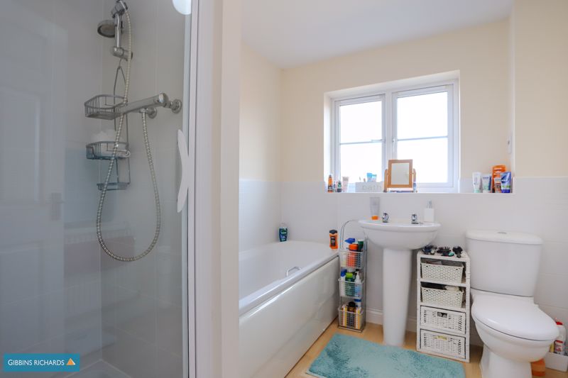 Rear aspect obscure window. Low level WC, wash hand basin, bath and separate shower enclosure.