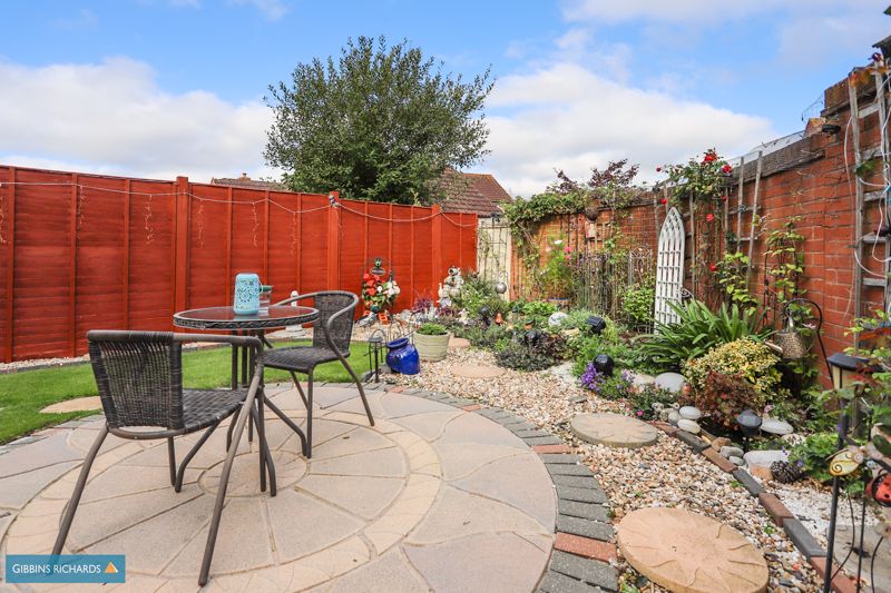 Landscaped rear garden with lawn and patio sections with access to double garage and double driveway.