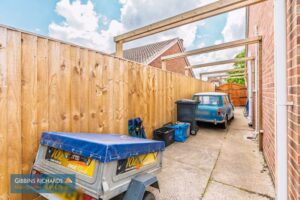 Gravelled parking to the front with addition of a side driveway and double timber gates leading to a detached GARAGE with light and power. The rear garden is fully enclosed with level lawn, covered lean-to as well as a personal door to garage with store facility behind garage.