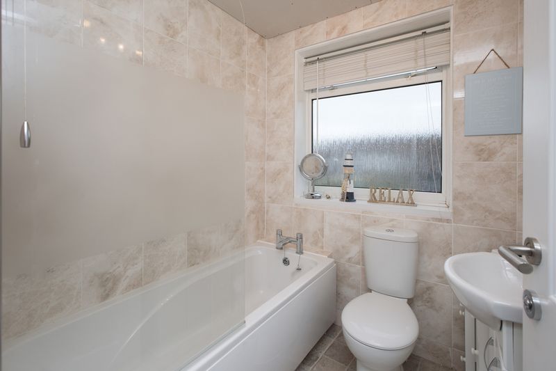 modern three piece suite with panelled bath with electric shower unit and screen, vanity wash hand basin, close coupled wc, ladder radiator, fully tiled walls and double glazed frosted window.
