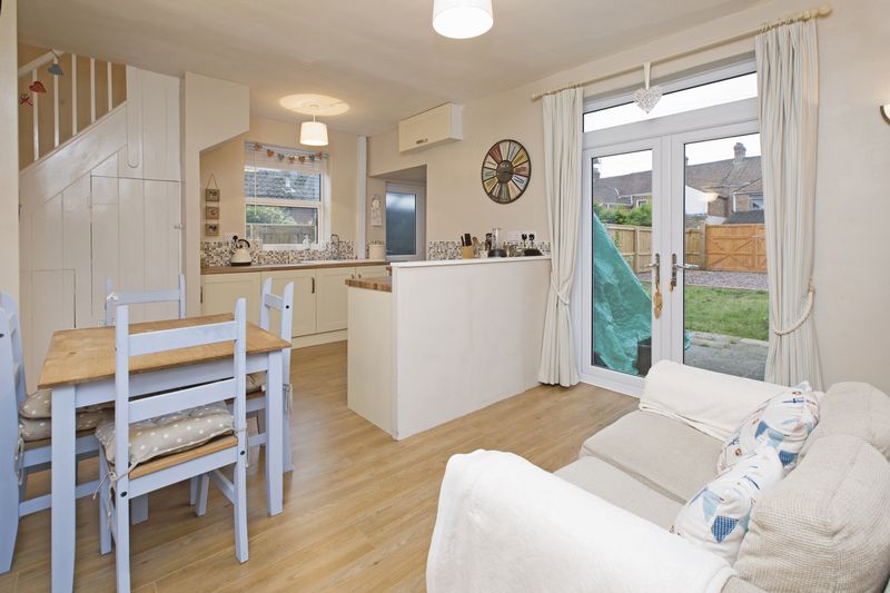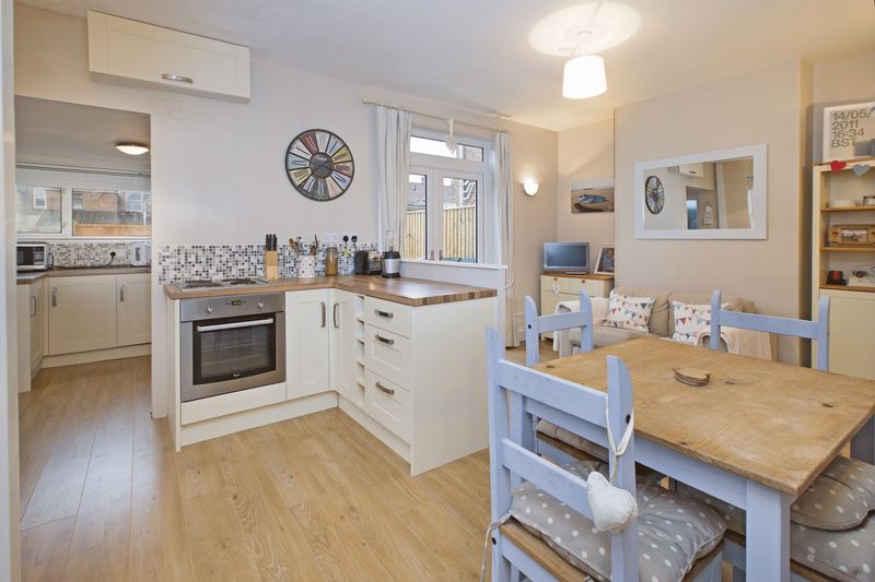 The kitchen area has been re-fitted with an attractive range of shaker style floor and wall cupboard units, laminated work surfaces incorporating a stainless steel oven and electric hob, ceramic single drainer sink unit with mixer tap, radiator, laminate flooring. Double glazed French doors from dining section to the rear garden.
