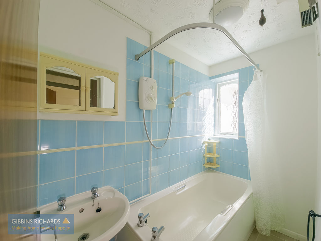 Rear aspect obscure window. Pedestal wash hand basin and bath with electric shower over.