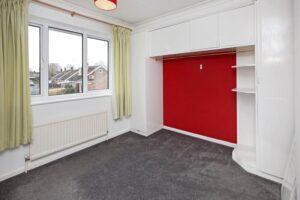 with fitted wardrobe and over stairs storage cupboard, loft access, radiator and double glazed window overlooking rear garden.