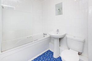 panelled bath, electric shower and screen, pedestal wash hand basin, close coupled wc, radiator, extractor fan, fully tiled walls.