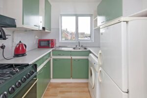 with fitted floor and wall cupboard units, gas or electric cooking points, double glazed window overlooking garden, plumbing for washing machine and wall mounted gas fired boiler.