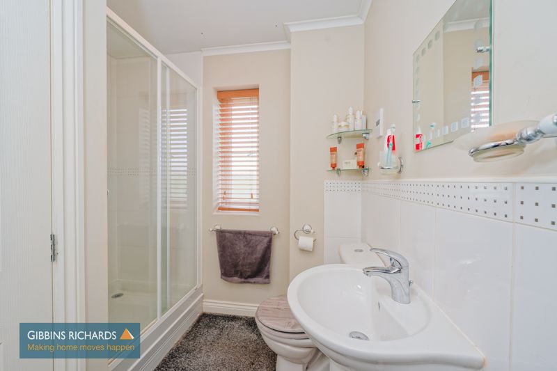 Front aspect obscure window. Low level WC, wash hand basin and walk-in shower. Storage cupboard.