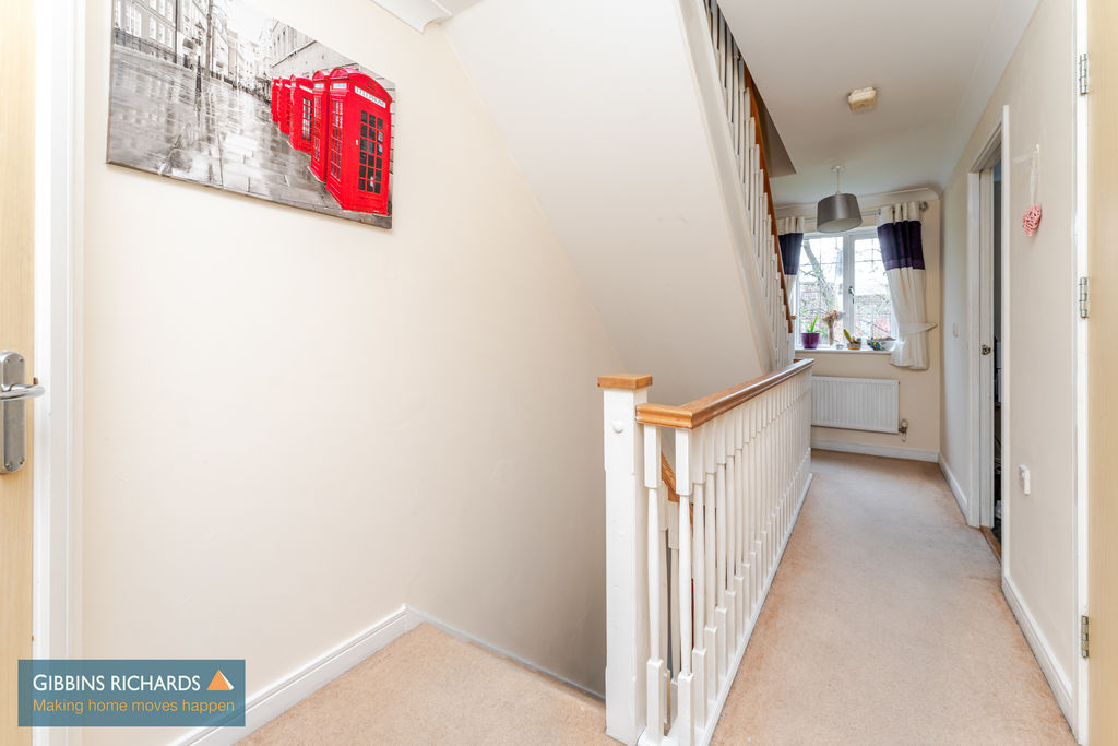 Leading to two bedrooms, family bathroom, storage cupboard, and stairs rising to the second floor.
