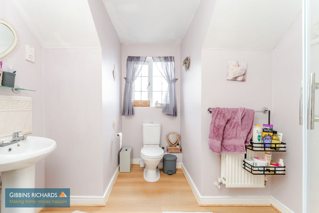 Rear aspect privacy glazed window, WC, wash hand basin, and bath with shower over.