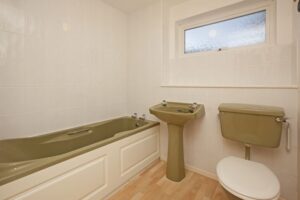 panelled bath, pedestal wash hand basin, low level wc, fitted wall mirror and full height tiling to bath area.
