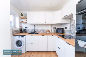 Rear aspect window and door to garden. Fitted floor and wall cupboard units with integrated fridge/freezer, dishwasher, electric oven and hob. Space and plumbing for washing machine.