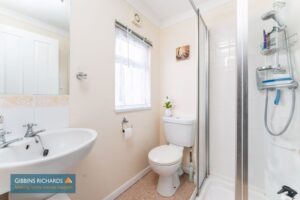 Rear aspect obscure window. Low level WC, wash hand basin and walk-in shower.