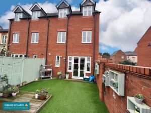 Small enclosed rear garden, predominately west facing with low maintenance artificial lawn and fence borders and a gate leading to a garage in the middle of a terrace of three with parking in front.
