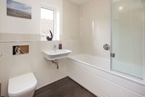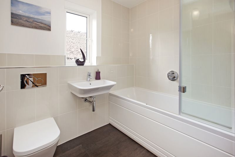 panelled bath with mains mixer shower and screen, wall mounted wash hand basin, close coupled wc, ladder style radiator, Amtico flooring, extractor fan and double glazed frosted window.