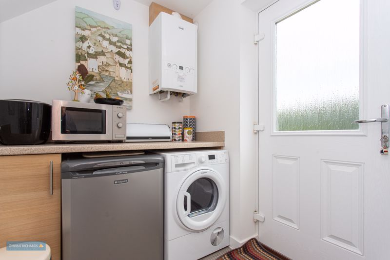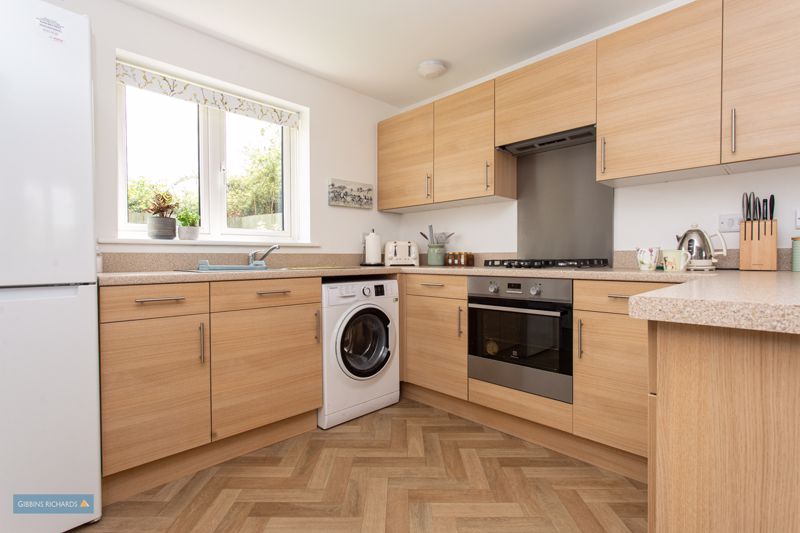 Attractively fitted with a range of floor and wall cupboard units with oven and gas hob with concealed extractor hood over, plumbing for washing machine and double glazed window to rear aspect.