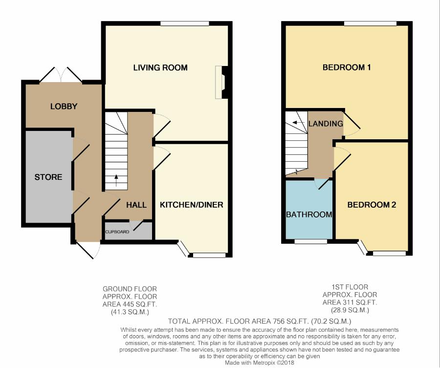 Side passageway with two useful store cupboards. Front garden and driveway for one car. Enclosed rear garden.