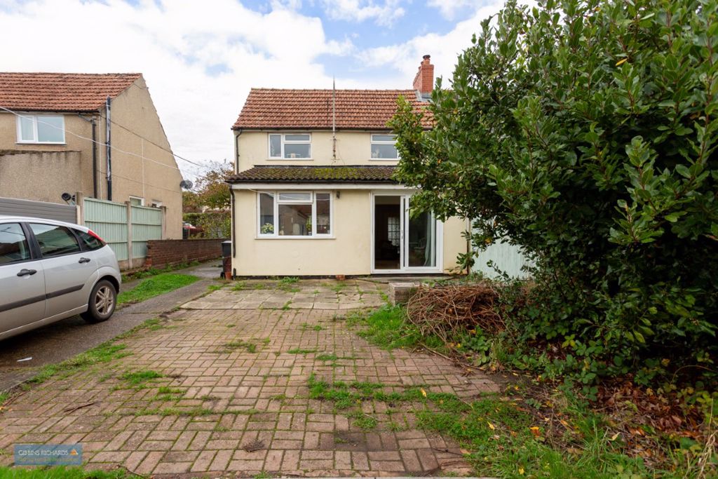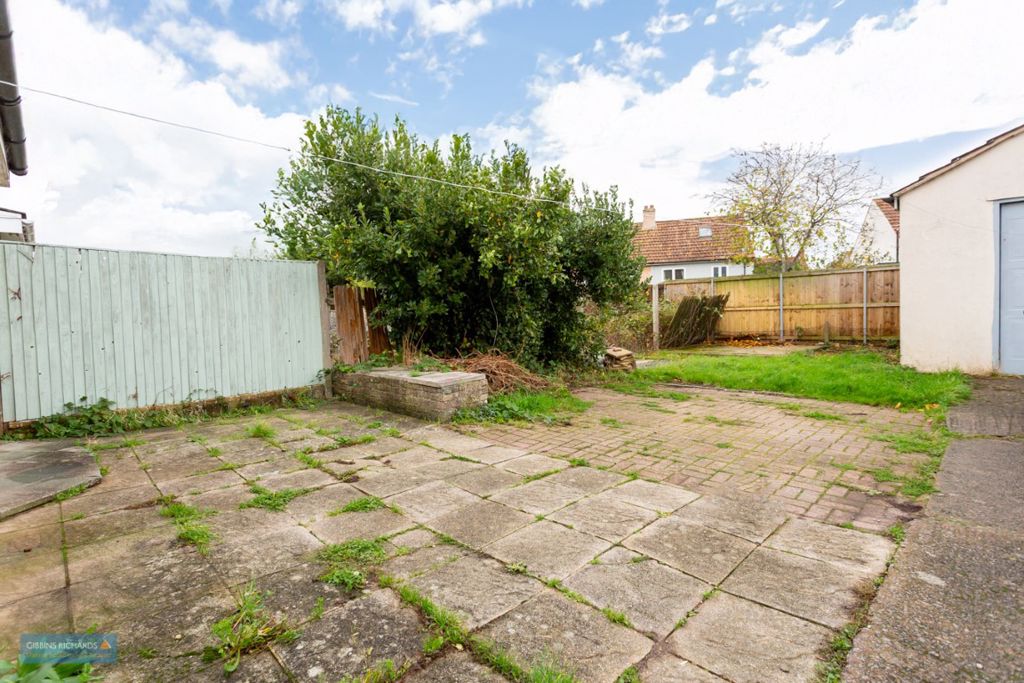 Off-road parking leading to a large garage and a predominantly south-facing rear garden.