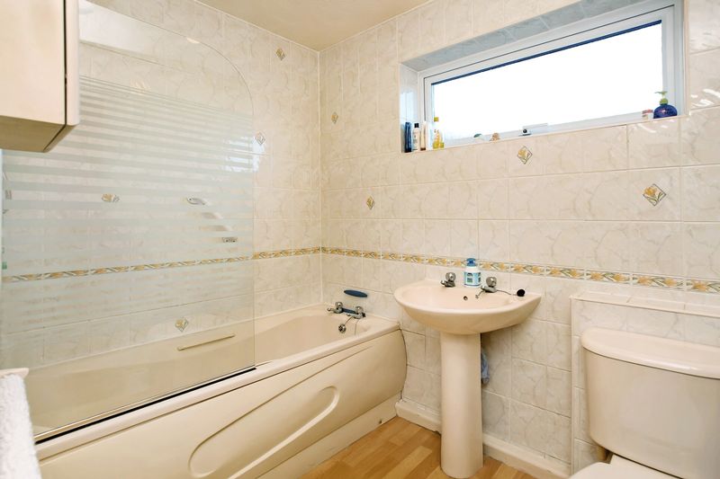 Fully tiled walls, three piece suite with Mira Sport shower over bath and glass shower screen to side.