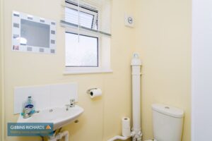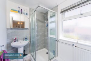 Rear aspect obscure window. Shower enclosure, WC and wash hand basin.