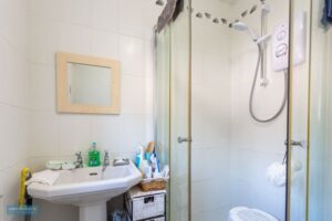 Rear aspect obscure window. Low level WC, wash hand basin and shower enclosure.