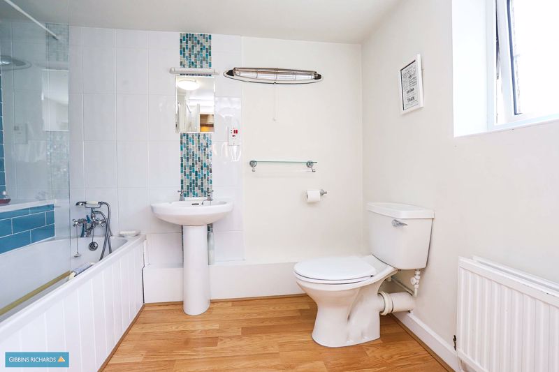Rear aspect double glazed window, white suite comprising bath, WC and wash basin, tiled splashbacks, wall mounted electric heater.