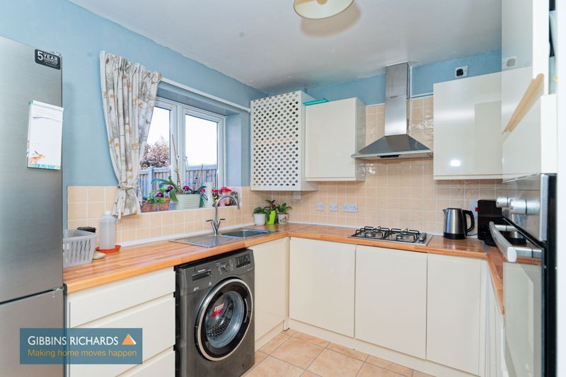 Rear aspect window and French doors to garden. Door to storage cupboard. Wall mounted concealed gas boiler providing main central heating and domestic hot water. Modern range of matching eye and low level gloss fronted units, space and plumbing for washing machine, integrated electric oven and four ring gas hob, extractor fan and light over.