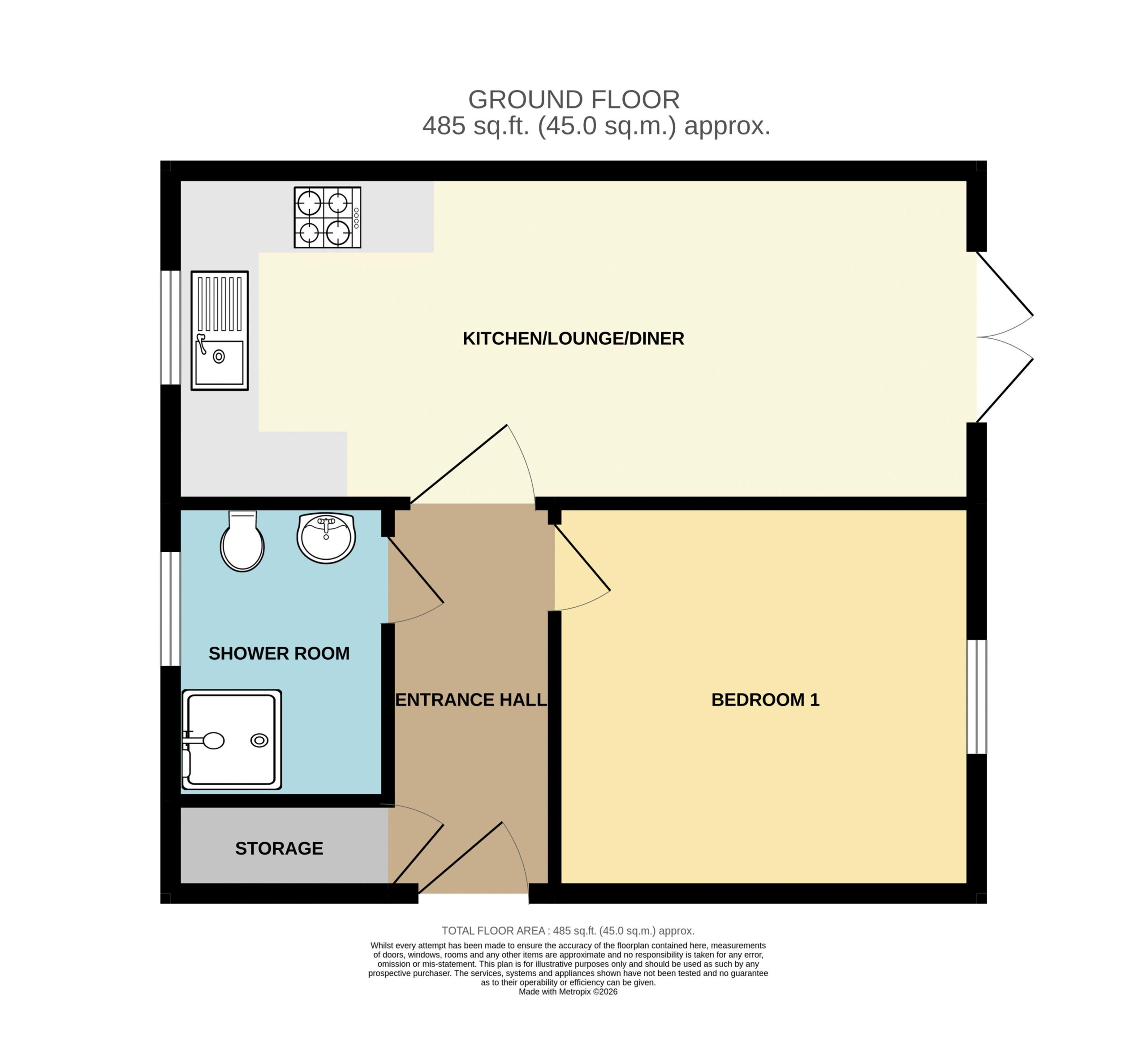 Doors to storage cupboard, shower room, bedroom and open plan kitchen/lounge/diner.