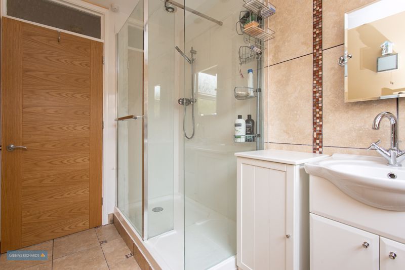 Fully tiled and with modern white suite comprising large walk in shower cubicle with mains fitted shower, inset washbasin, heated towel rail, opaque window.