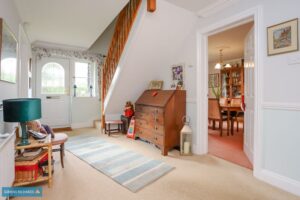 Doors to sitting room, dining room, kitchen, ground floor WC and double doors to storage cupboard. Stairs rising to first floor and window to front.