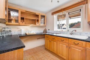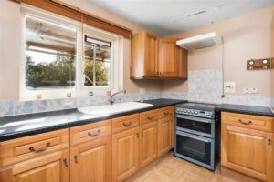 Light oak floor and wall cupboards, recesses for fridge/freezer etc. Plumbing for washing machine and dishwasher.