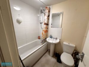Fitted with a white three piece matching suite comprising low level WC, pedestal wash hand basin and bath with shower over. Extractor fan.